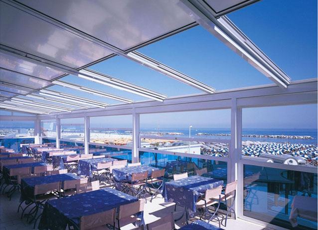 Coberturas móviles motorizadas en aluminio con perfilería simple y de corte térmico.